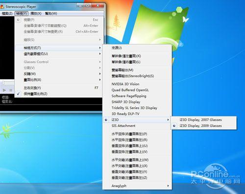 3D电影播放方面,我们使用Stereoscopic Player软件进行设置。Stereoscopic Player是一款能够将2D电影转换为3D电影的播放软件。这里,我们将“检视方式”设置成“iZ3D Display,2009 Glasses”。