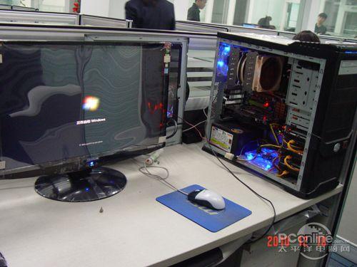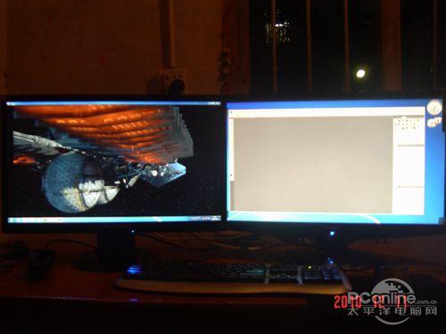 这是ViewSoniv的23.6英寸3D显示器,在GTX460 1GB SLI支援下的工作场景。在这个场景中,包含了两个3D要素:1、屏幕刷新率高达121MHz的3D显示器;2、3D性能强大的GTX460双卡系统。
