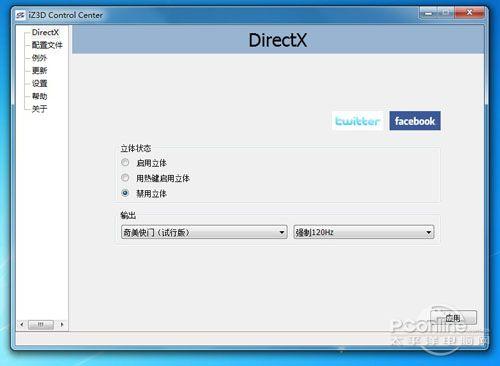 打开进入控制界面。界面第一项为“DirectX”设置,用户可以在这里选择“开启”或“关闭”3D显示模式。下面的两行菜单分别为“输出模式”和“刷新率锁定”,可以调节3D显示的模式(液晶显示器附赠的眼睛为奇美快门式眼镜,因此3D模式我们选择“奇美快门”);如果您的电源为50Hz,那么刷新率请选择”强制100Hz“;如果您的电源是60Hz的,请将刷新率选为”强制120MHz)。
