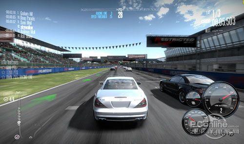群车竞技的场面也很阔大,玩家的视界被延伸到了整个赛场,你有一种坐在观众厅中,隔着“玻璃”,居高临下的俯视整个赛车场的感觉!