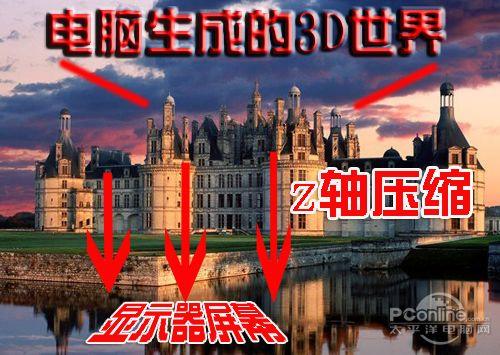 由于我们的屏幕是2D的,只具有长和宽,没有“高”。因此,3D图像在从计算机“内部”到达屏幕前,都要被一个叫做“Z-BUFFER”的技术,压缩成2D画面。打个比方,就好比我们小时候经常玩的那种一拉开就会出现一座城堡或一片山林的立体剪纸板。只不过,玩的顺序被颠倒了,电脑先为我们雕塑出立体的山丘和城堡,然后压成一张纸片,塞进我们的23寸或24寸的液晶屏幕中。