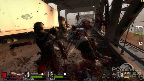 《生死四人组2》最后一关:“幻灭”,冲刺“僵尸桥”的场景。在普通的2D液晶中,游戏里的僵尸只是“靠近”你的屏幕。而在奇美快门式3D眼睛的“衬托”下,僵尸群“迎面扑来”,冲撞着你的屏幕,几欲破框而出!并且,四溅的肉浆浓浓的“涂”在了屏幕上,飞射的血雾也喷到了眼镜表面,非常刺激!