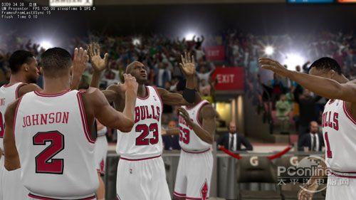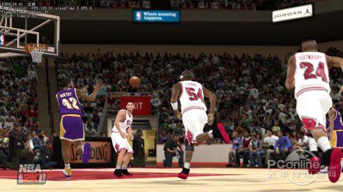 在大量运用景深特效的NBA 2K11中,整个运动场的空间纵深感被营造得非常强烈。这个视角给笔者的感觉,就像自己是场边的摄影记者,用佳能大炮,抓拍公牛王朝一次进攻的瞬间!
