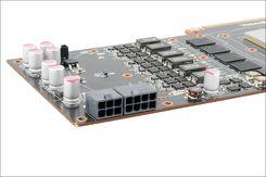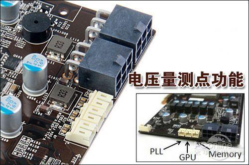 在显卡外接供电接口部分有三个接口,也就是PointsV-Check Point电压量测点功能。透过电压量测点,简单运用三用电表即可轻松掌握所有的电压状态,完整掌握超频时的各项信息,让超频变得更轻松、更容易。