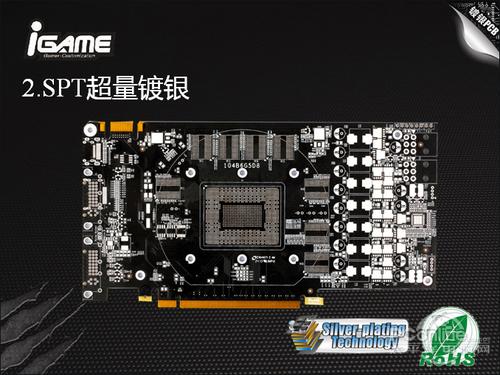 PCB本身的基板是由绝缘隔热、并不易弯曲的材质所制作成。目前,显卡业内普遍采用了镀铜PCB、抗氧化板(OSP板)和喷锡板,而iGame显卡 PCB上采用了“SPT超量镀银”工艺则是一个特例。相比于旧有的镀铜PCB,拥有更好的散热性,并且保持每个接触点在百万次的工作中,依然持久快速反 应。在2009年推出的七彩虹iGame260+显卡上,首次使用了SPT超量镀银技术。而在七彩虹 iGame 450 烈焰战神U D5 1024M上依然装配这种技术。