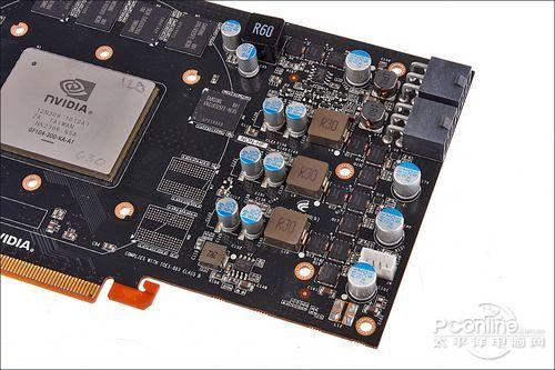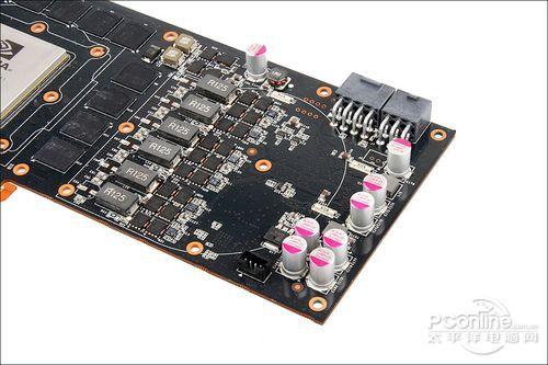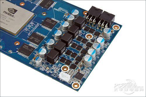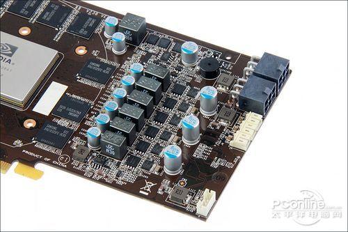 供电方面,NVIDIA Geforce GTX460显卡采用了3+1相的分离式供电设计,陶瓷电感以及全固态电容的做工不俗,加上8pin高供电转换率的MOSFET使得显卡的供电部分发热量 更加小,有利于冲击更高的频率,从后续测试可看出,NVIDIA Geforce GTX460显卡可以冲击800MHz以上的极限核心频率,相当抢眼。