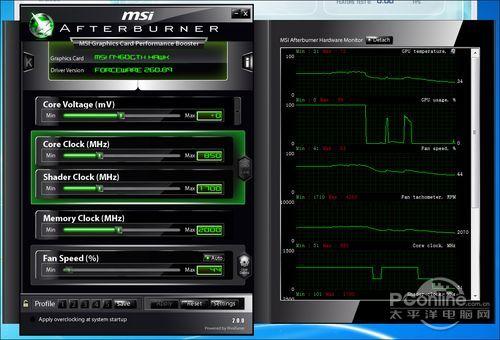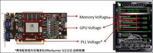 首先就是首创三重超电压功能,显卡内建三重超电压功能显示适配器,支持调整显示核心、内存、PLL电压。需要注意的是,这需要通过微星的Afterburner超频软件来实现,也就是我们进行显卡超频测试时经常用到的超频软件。