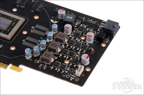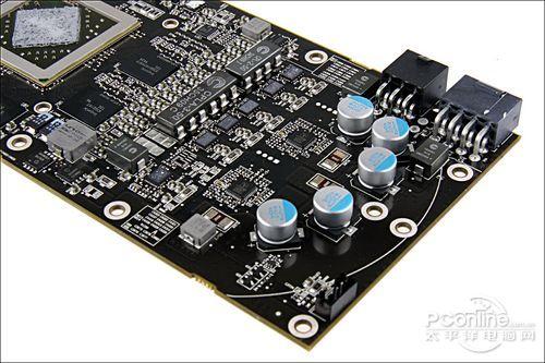 供电方面1+1相分离式核心+显存+I/O供电设计,能避免相互之间的干扰现象。与HD6870显卡相比核心供电少了1相,每相供电均配备了做工不俗的陶瓷电感与全固态电容,PCB上微小的供电元件也是高效稳定供电的保证。