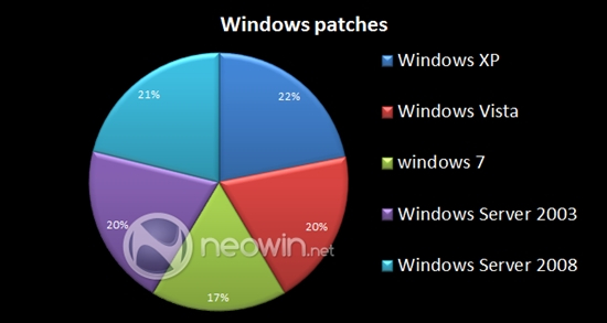 Windows XP被修复的漏洞数量在各Windows版本中是最多的,共有58个,种类包括远程代码执行、权限提升、DoS拒绝式攻击等等。随后是Windows Vista,修复了52个漏洞,Windows 7修复了52个漏洞。Windows Server 2003和Windows Server 2008分别修复了54个和56个漏洞。