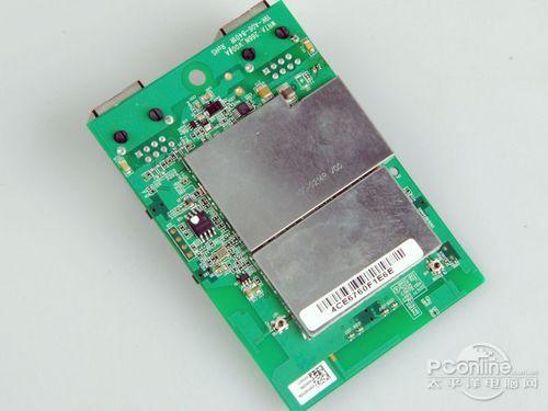 我们可以看到WLAE-AG300N内部分为两大部分,供电和网络两块是独立分开的。而且中间还有一层薄金属板来隔离电磁干扰。在网络部分电路板上,芯片组也有自已全密封的金属屏蔽层。