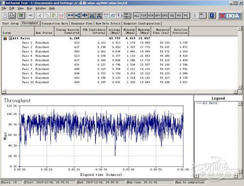 速率测试环节我们采用了英特尔(迅驰2)平台和Intel(R) WiFi Link 5100 无线网卡做兼容测试,并使用被业界公认的常规测试软件Chariot 5.4来进行。Chariot测试采用了两台服务器,安装NETIQ公司的Chariot软件,一台接路由器WLAN口,一台接LAN口,通过统计一个预定长度和格式的脚本文件无差错地从一台服务器传送到另一台服务器的时间来计算出路由器的Throughput(吞吐量)