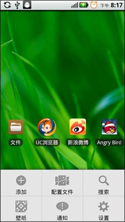 不过其实91熊猫桌面除了主题更换外还有非常丰富的美化功能,在这里也简单地介绍一下。从下面两张图对比可知,91熊猫桌面安装之后,待机界面下功能键唤出的菜单有了变化。“配置文件”不见了,取而代之的是主题Market的选项。另外点击“设置”之后也有所变化,多了一步选择进入系统的设置菜单还是进入熊猫桌面的设置菜单。