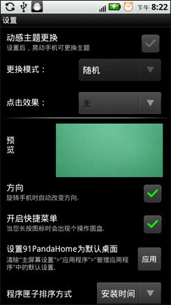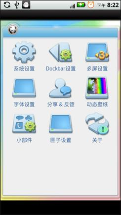 从91熊猫桌面的设置菜单来看,它的功能也不仅仅是更换主题这么简单,它还可以对整个系统界面做一定程度的定制和优化。比如说支持晃动手机更换主题;比如说支持最多六个的Dockbar,可以在屏幕边缘添加可隐藏的磨砂工具条,用来放置各种安装程序;比如说可以定制待机主屏的个数(5至11)和默认主屏;比如说设置系统的字体、大小和颜色;甚至添加更多的一些桌面组件。