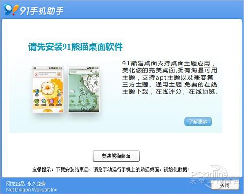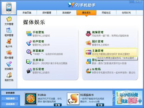 打开91手机助手,使用数据线将手机与电脑连接后会自动提示安装驱动程序。安装成功、手机被识别后便可进行各种操作。点击媒体娱乐--主题管理,会提示需要在手机端先安装专门的主题管理工具91熊猫桌面。91熊猫桌面支持桌面主题应用,支持apt主题以及兼容第三方主题、在线主题库里还有大量的主题素材可供下载。