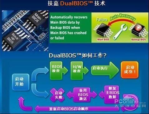 在电脑每次开机时,DualBIOS会以主BIOS启动,如果侦测到启动成功,则系统正常进行硬件自检等后续步骤,并正常启动,这一点与其他主板无异。但当DualBIOS侦测到主BIOS启动失败后,DualBIOS技术便会自动激活备份BIOS,并从备份BIOS读取数据,尝试自动刷写主BIOS,使其恢复正常,然后再次尝试从主BIOS启动。因为备份BIOS的芯片在通常情况下是不可写入的,所以它也不会收到病毒等软件的干扰,这也就可以保证恢复至主BIOS的数据是完好的。这样一来,在病毒破坏主BIOS时,或者用户在更新BIOS时发生意外情况导致主BIOS数据受损时,备份BIOS就可以自动恢复,以保证系统能够正常启动,从而避免由于BIOS损坏而需要使用“热插拔”,甚至使用编程器修复BIOS芯片的复杂操作,这也进一步保证了系统的安全。