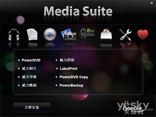附件光盘内置了CyberLink多媒体套装Media Suite系列软件,集照片、视频、音乐、电影、数据刻录等众多媒体软件于一体。