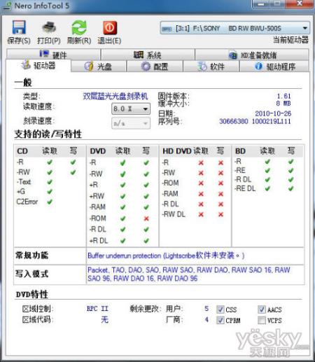 本次测试中,通过Nero InfoTool的检测数据,可以查看到改款刻录机自带8Mb缓存并支持全系列BD光盘的读写操作。在读刻性能方面,虽然无法达到光驱的最大刻录速度,但已经达到了光盘的最大极速。并且,在实际的使用过程中,这款光驱在噪音控制方面表现得也相当不错,高速运转下几乎听不到些许杂音。