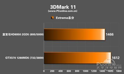 最后我们进行了3DMark 11的测试来简单检验这款HD6950显卡的性能,平台为AMD Phenom II X6 1090T+890FX主板+4GB DDR3 1333内存,系统为Windows 7 Ultimate 64Bit,驱动为催化剂10.12。我们还加入了报价比它高出600元的GTX570显卡的性能对比,测试成绩如下图: