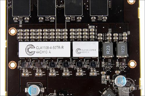 至于供电部分,蓝宝石HD6950采用了数字供电设计,也就是核心与显存的分离式供电方案。核心部分共使用了Volterra VT1156MF芯片,搭配2颗CLA1108耦合电感,组成豪华的4相+2相数字供电方案,比起Radeon HD5870时代的4相提供更高的供电负载。显存同样采用数字供电方式,两颗R23电感组成2相供电。