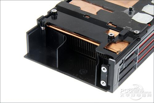 蓝宝石HD6950采用了真空腔均热板的传热方案,真空腔底部的液体在吸收芯片热量后,蒸发扩散至真空腔内,将热量传导至散热鳍片上,随后冷凝为液体回到底部。该卡的真空腔均热板散热块同样焊接到散热支架中,所以我们并不能普通工具来拆下来。