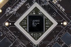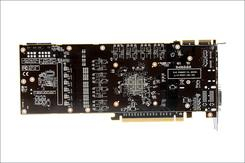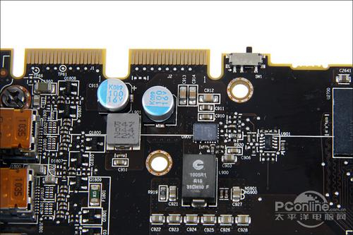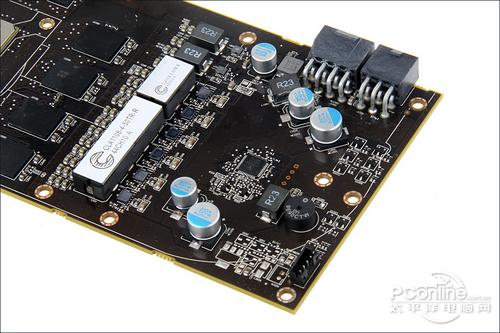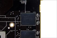 PCB做工上,显示核心进行45度放置设计,配合核心周边的金属框形成了同一水平面,并且边角不成同一直线,核心四角接近金属框,让显卡散热器安装的时候不容易对核心造成损坏。