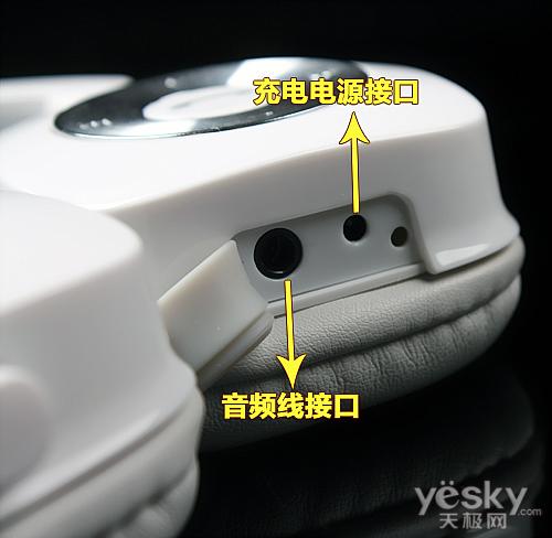 左边的单元壳体下方,隐藏着两个孔位,一个是3.5mm端口音频接口,通过音频线接上后可以当做普通的耳机连接MP3手机、电脑等数码设备。外面有一层胶垫,可以遮挡住接口。比较密实,有效防止灰尘杂物。