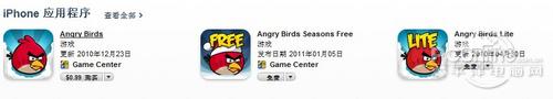 目前苹果iTunes上提供的愤怒的小鸟(左起:原版,季度版,免费版)