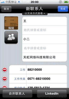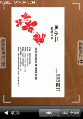 同样,你只要用你的iphone的照相机拍对准要记录的名片拍摄,然后软件会进行辨识,并把名片上的姓名、公司、部门、职称、地址、电话、电子邮件等信息自动分析并放入到正确字段,再导入你iphone的通讯录内,从此以后,就无须逐笔输入通讯录。