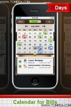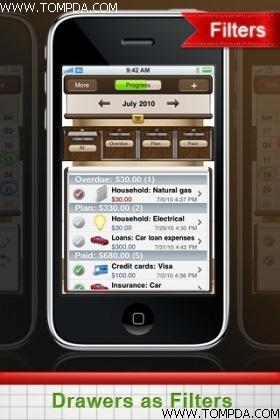 设定一个数值来指定本月预计的开支,在大日历上标出您需要付款或者购物的日期。点击下面的黄色箭头可以上下滚动日历。然后当实际进行交易时,可以很快的进行任务确认。也可通过日历和专门的选框来过滤账单。如果超出了本月计划,日历上的绿条会及时的进行提醒。