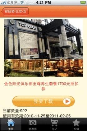 省钱猫是一款免费手机软件。通过简单的几步,就可以轻松查询吃喝、玩乐、购物、生活等各种类型的优秀特约商家信息,并可下载特约商家提供的电子优惠券和电子打折卡。用户在商家消费完毕后,向商家出示省钱猫客户端中的优惠券和打折卡,实现打折优惠消费。
