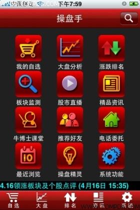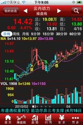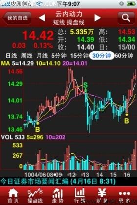 在iPhone特有的操作属性下,操盘手把页面的切换做到极致。除了有清晰的菜单栏选择外,K线图的放大和缩小、周期选择、个股切换,主力资金功能切换,都实现了一指一键切换,在iPhone的大屏界面上,操盘手为用户在最适当的位置,提供最明确的按钮设置,只需一键瞬间切换所需界面,及时把握市场动向。