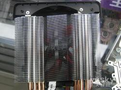 华硕皇家骑士散热器底部经过了镜面处理,相当平整、光滑,可以充分的和CPU表面接触,最大可能的吸收废热。纯铜热管可以说是目前高端散热器所必备的,而热管数量的多少,从某种意义上也左右着散热效果的好坏,这款散热器提供了六根热管,一侧为四根,而另一侧为两根,六根热管的跨度也很大,贯穿于密集的散热鳍片之间,是散热性能极大增强。