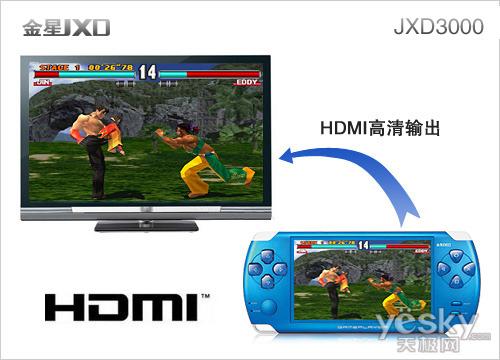 游戏支持HDMI输出,媲美家用机。输出的画面、声音与专业家用游戏机效果一样。实际是JXD3000的游戏机输出到电视上玩,效果更好。目前家用游戏机市场只有SONY PS3、任天堂的WII、微软的XBOX360在游戏中PS 3D游戏机金星JXD3000立体音效更是重要至极,除了增加玩家战斗的真实感,让玩家感觉真的在挥舞兵器,兵戈相向,更可以通过声音判断对手的动态,预先做好回应准备,让战斗更加真实立体。
