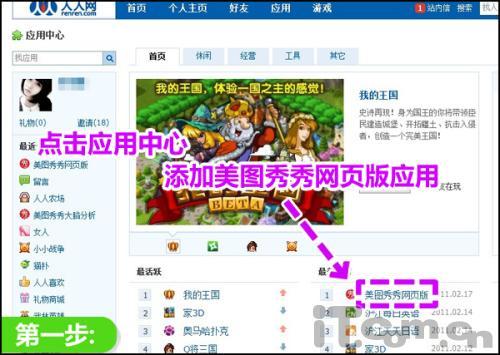 第一步:只要进入人人网个人主页的“应用中心”,童鞋们就可以在“最新发布”里找到“美图秀秀网页版”的应用拉,点击添加就能开始用了。