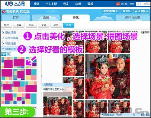 第三步:进入“美化”菜单中的“场景-拼图场景”,挑选一个自己喜欢的模板,点击应用。