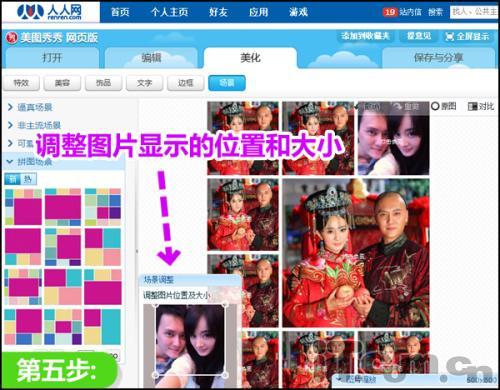 第五步:上传后,在左下角的“场景调整”中,调整图片在模板中要显示的位置和大小。