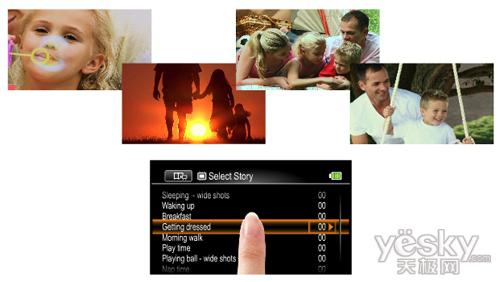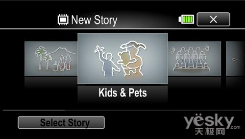 “电影风格”功能包括情节生成器、电影效果滤镜、触摸装饰等三大部分。其中,情节生成器在数码摄像机内预设了5个情节主题以及相关该主题推荐的拍摄场景提纲,可以让用户拍摄的内容不再是无序的记录,而是创作出具有故事情节的“影片”。用户只需在拍摄前选择主题和剧情场景,并按照内容设定进行拍摄,即可获得具有影片效果的视频。另外,用户也可根据自己的需求,设置新的情节主题和拍摄内容。