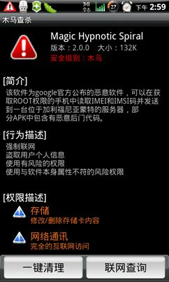 4、Google官方已经远程删除木马本身,但对于木马安装到手机中的下载器程序,Google尚无办法远程修复,木马下载器仍将继续在手机进行破坏。