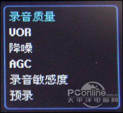 三星YP-VP2一共提供了四档录音效果,包括RAW无损录音、高中低三档。VOR能够使音量平衡,不会出现忽大忽小的现象。降噪功能对噪音的控制效果十分明显,如果不开启的话,录音的质量会大打折扣。AGC增益和灵敏度则根据需要自己设定。预录功能主要针对在关机的情况下,通过“5秒预录”功能可随时启动随时录音,不必担心因开机速度而贻误录音内容。