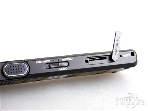 三星YP-VP2提供了音乐、会议、采访三种录音模式快捷键设计,通过机身右侧的拨动键可以迅速满足用户多种用途录音需要。Interview为采访模式,Music为演唱会模式,Meeting为会议模式,三种模式的录音效果截然不同,比如采访模式会削弱周边环境的声音,单独对采访者进行方位录音,声音清晰准确。而会议模式适合多人录音,对空间环境的声音敏感强度较大。选择对应的录音模式,对录音的质量有明显的提高。除了机身自带的2GB储存空间外,三星YP-VP2还支持TF卡扩展,旁边提供了方便的挂绳孔。