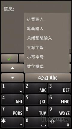 由于实体全键盘的提供,E7-00取消了此前有些机型上所配备的虚拟QWERTY键盘的输入方式,可选择框式手写、字母数字键盘、全屏手写的输入方式,自然也保留了文 字的复制/粘帖功能。在与触控相关的输入法中,评测人员觉得最好用的是字母数字键盘输入,在E7-00 4英寸的屏幕上虚拟出的数字按键区域很大,并且配以虚拟按键振动反馈,操作时得心应手,效率也算不错。由于该输入方式与标准诺基亚手机的实体按键操作基本一致,普通用户上手应该不会有多少难度。