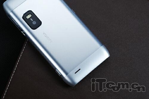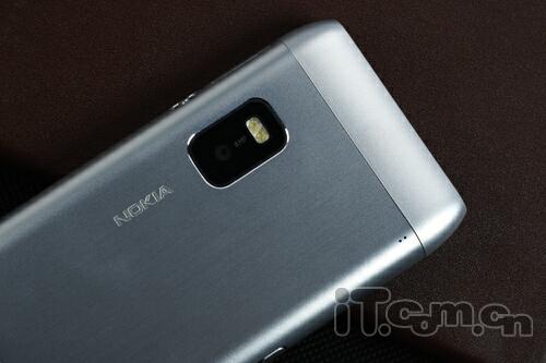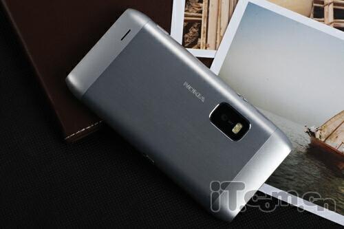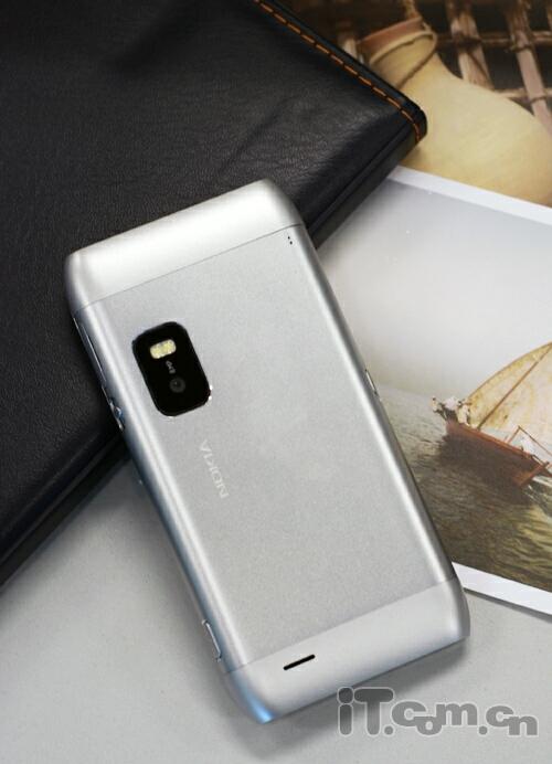 机身后部,E7-00采用了一体式的设计,所以我们也不用担心什么镜头盖设计了,带有LED补光灯800万像素摄像头配置比起N8来说有些降低,而且还不支持自动对焦,不过对于商务用户来说已经足够了,另外底端还有一个扬声孔设计。
