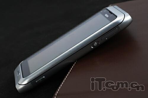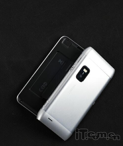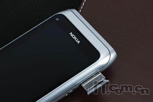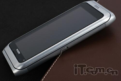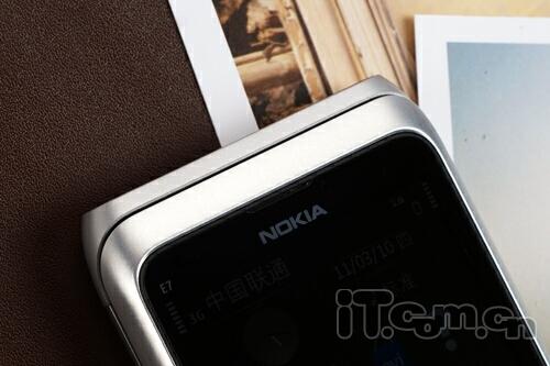 在E7-00的屏幕周边有一圈银色的金属镶边,视觉效果上提升了产品的档次,至于屏幕背面则是一体化的金属材质打造,而机身材质则是一体化的阳极氧化铝,非常持久耐用,机身两端和N8一样,采用了收缩的设计,上下两端则是采用了黑色的塑料密封,整个产品工艺一流,绝对称得上是一件工艺艺术品,足以体现诺基亚顶级的工业设计实力!