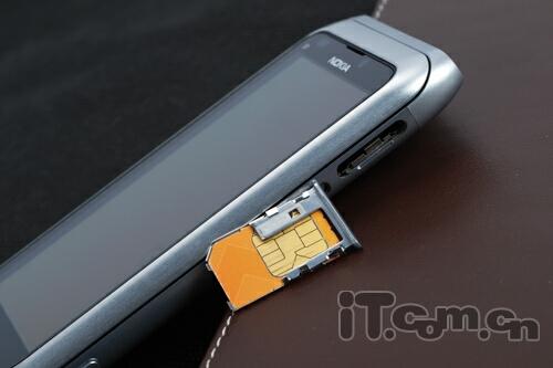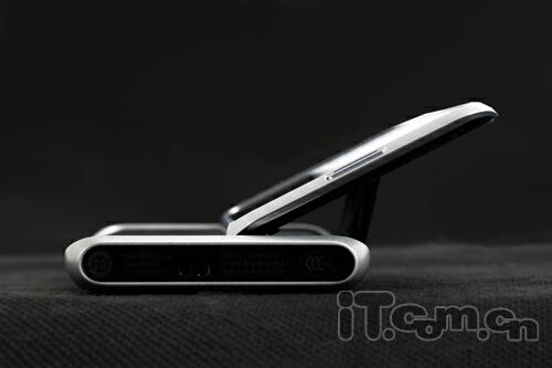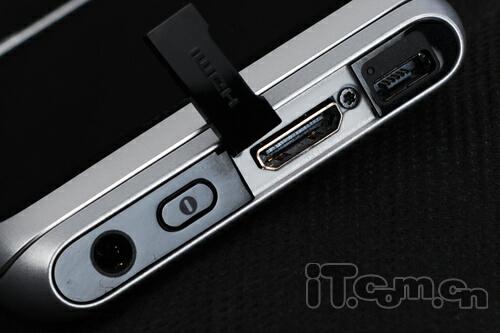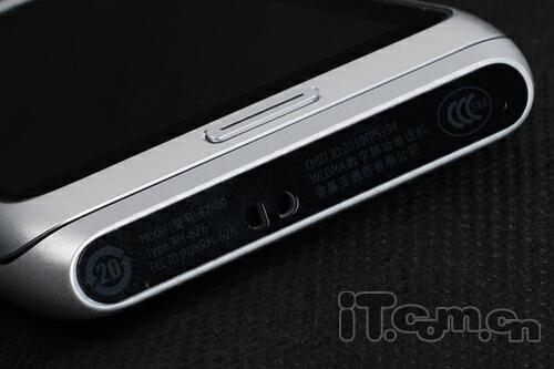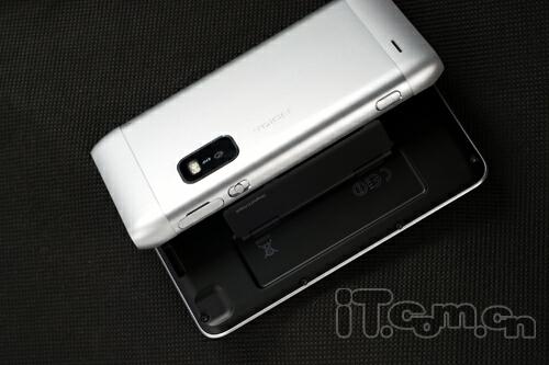 如果说金属材质机身有什么不好的话,那就是太滑了,不过好在E7-00两端的弧线可以很好的符合手握的造型,机身顶端设计有电源键与3.5mm耳机插孔(仍然没有保护盖),旁边则是多合一micro USB插槽和HDMI输出端口,E7-00可直接连接显示器和电视播放1080P高清影片,值得一提的是micro USB旁边还设有一枚充电指示灯(白色),另外锁机键设计在了机身左侧,音量键以及拍摄键则常规性地排布在手机的右侧,而且还有SIM卡插槽,笔者对其侧键的手感还是值得肯定的。