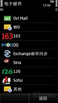 E7-00内置的邮件还支持个人邮件推送服务,内置了Ovi邮件和国内主流邮箱,包括163、新浪、QQ、搜狐,和Wo等,以满足个人用户的邮件需求。用户可以在任意一个邮箱中自由切换到Mail for Exchange或是其他邮箱。并且还可以实现包括163和126等邮件的推送功能,带给诺基亚手机用户更加高效、实时的移动邮件体验。
