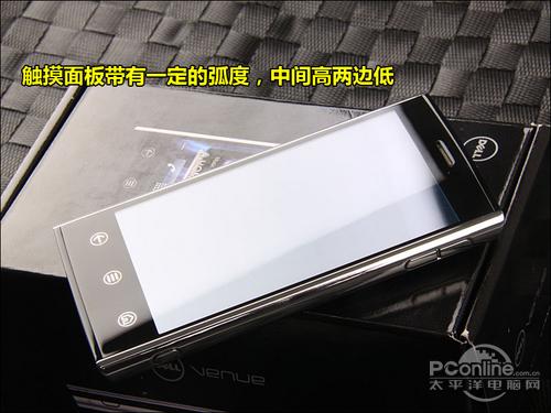 屏幕表面弯的情况并不多,之前在Nexus S上跟大家展示的是上下翘,中间凹的屏幕。这次的戴尔Venue确实一款左右低,中间凸的屏幕。当然这里凹凸的程度都很轻微,并且只是最外面的玻璃厚度作怪,不是屏幕本身。