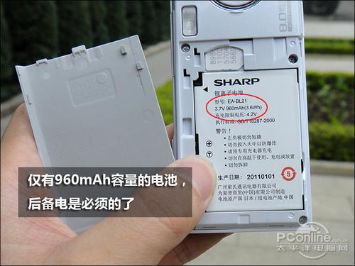 夏普SH7218U由于机身比较狭长和薄,所以电池的容量也并不是很高,只有960mAh,这大概也是Android手机中电池容量最小的一款之一了。不过日系机一贯都是采用这种小电池的设计,估计也是直接采用原型机的电池的缘故。从实际的使用情况来看,夏普SH7218U的续航能力并不是很强,毕竟高分屏摆在那里,一天一充是必须的,后备电池也是必要的。