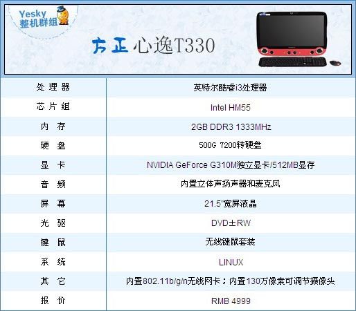 方正心逸T330-3255是方正新推出的一款主打家庭市场的新机,外观延续时尚复古的民族风格,并搭配英特尔酷睿i3处理器,NV G310M独立显卡和21.5英寸宽屏液晶显示屏。完全可以满足用户日常办公及娱乐要求,感兴趣的朋友可以多多关注一下!