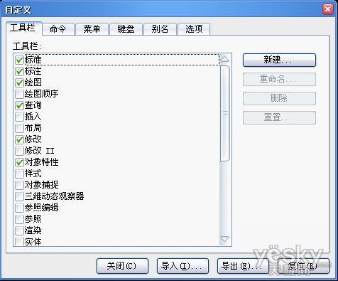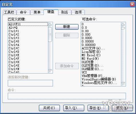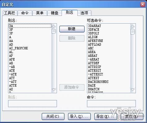 上图中我们可以看到,在此对话框中有工具栏、命令、菜单键盘、别名等选项。这里着重介绍的是键盘和别名的自定义。