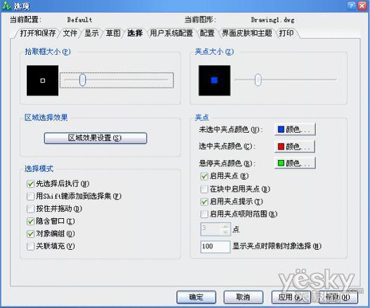 5)在“选择”对话框中,我们可以设置拾取框大小、区域选择效果、夹点大小和其他的一些设置。